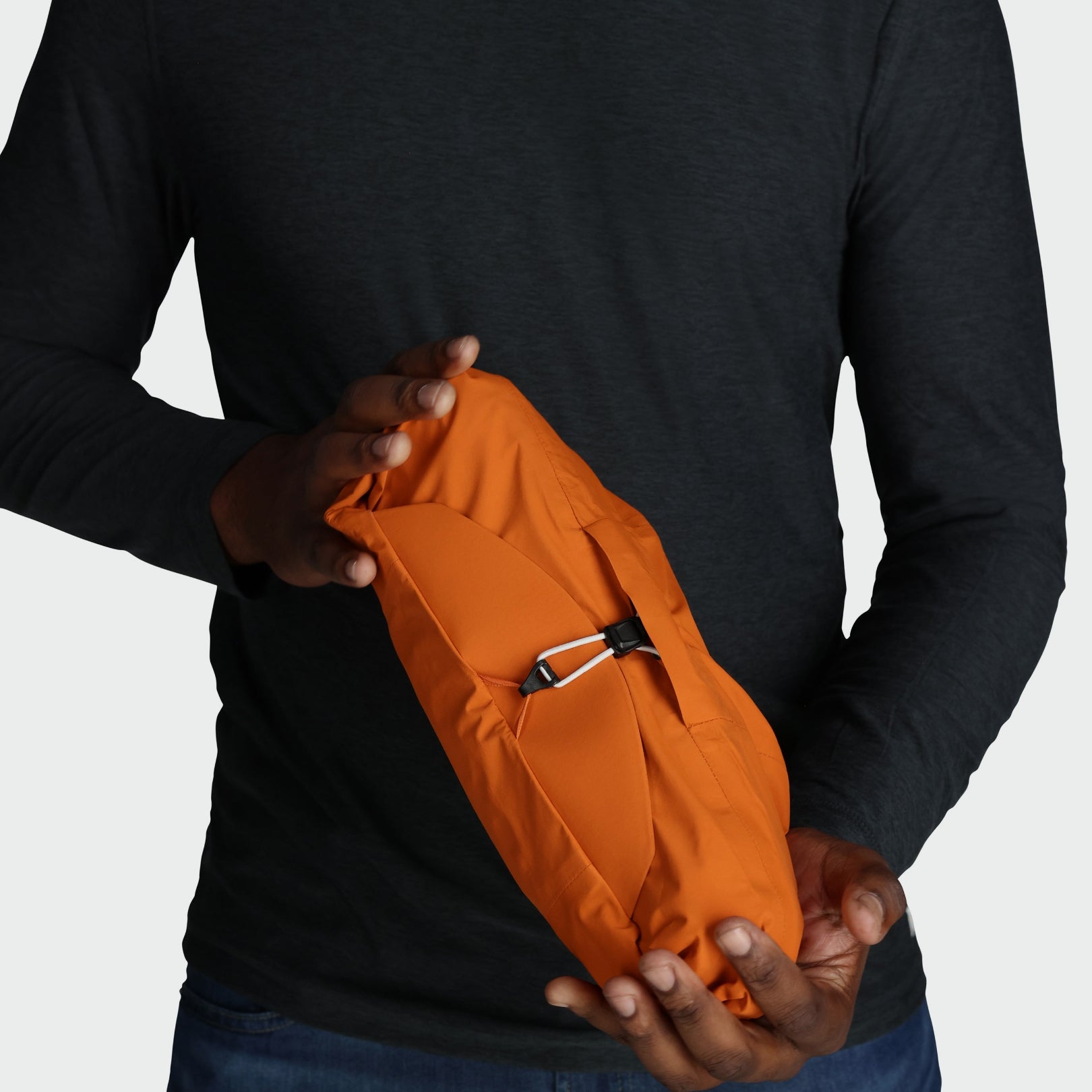 - Jacket can be rolled into the hood and secured with integrated cinch hook for compact storage