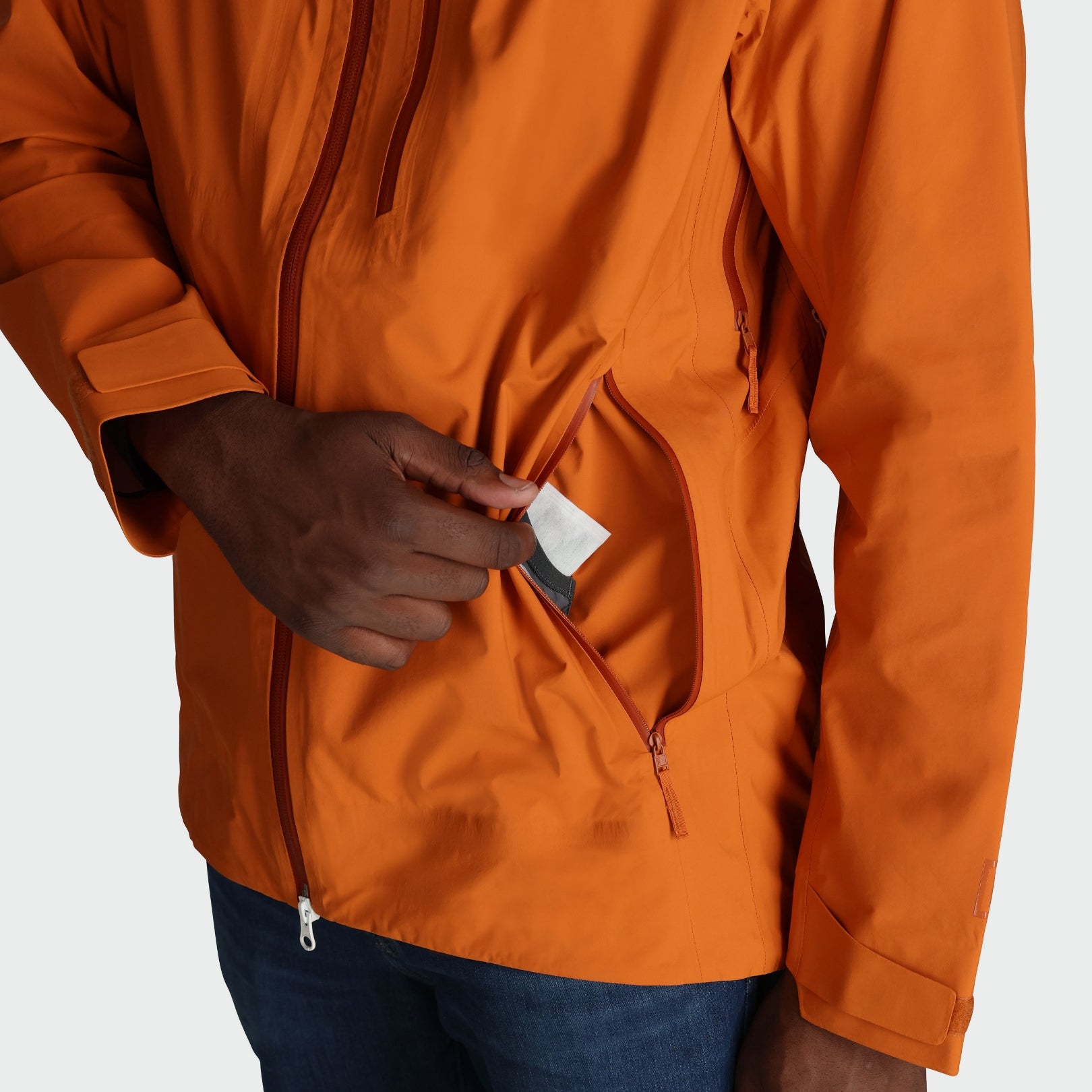 - Zippered pockets at chest, hands, and rear